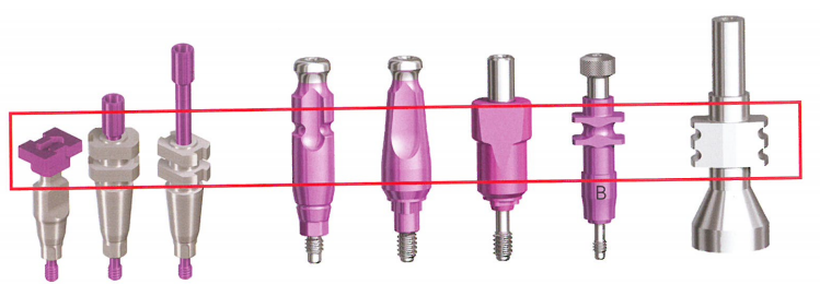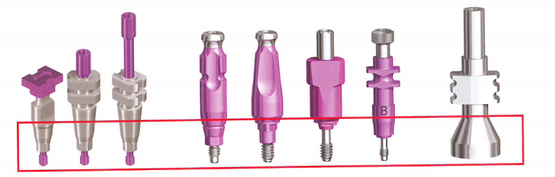 转移体主要是用来转移种植体在口内的位置、轴向,按其设计的不同,分为开窗式转移体、非开窗式转移体、抗旋转移体、非抗旋转移体、种植体水平转移体、基台水平转移体,且不同种植品牌的转移体外形设计又各不相同。