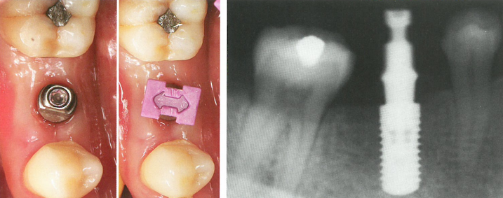 取模前,46种植体愈合基台完全暴露于口腔,检查垂直修复距离充足,根尖片检查种植体骨结结合良好。