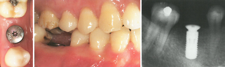 患者A1的46种植术后3个月,口内检查见软组织健康无红肿,愈合基台已完全穿出牙龈,垂直修复距离尚可;根尖片显示种植体周围无低密度透射影。