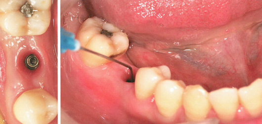 旋下愈合基台,生理盐水反复冲洗,清洗种植体周围的牙龈袖口。