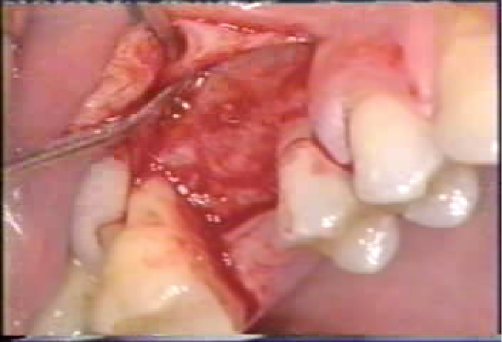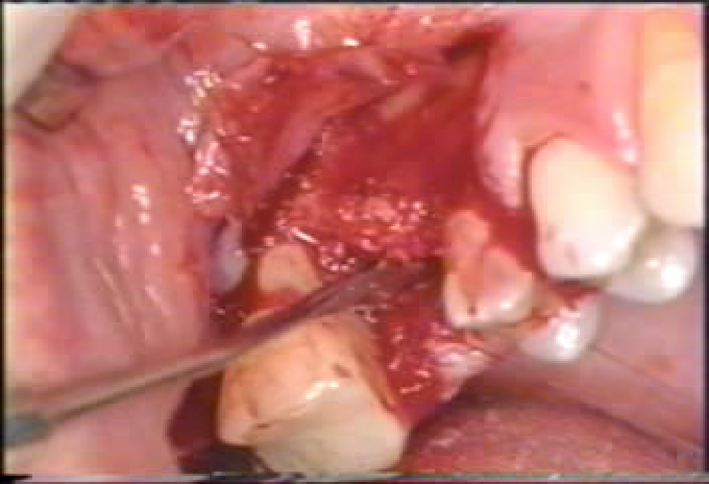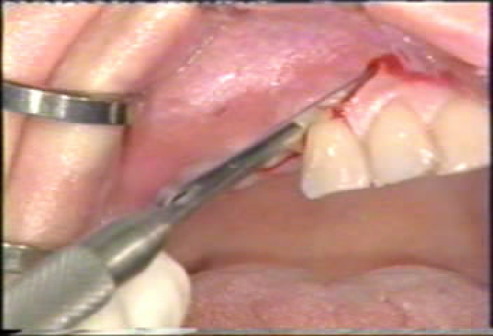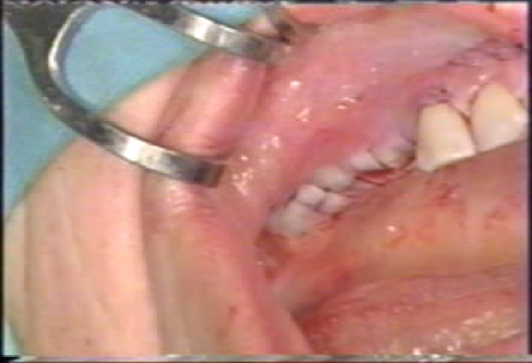 局麻下牙槽嵴顶切口,翻起粘骨膜瓣,暴露牙槽嵴顶;
