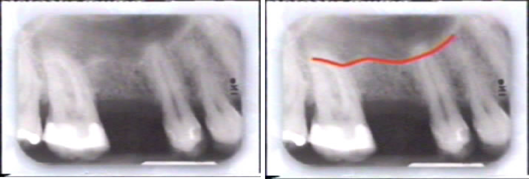 ②摄X线曲面断层片,按其放大率计算上颌窦底至牙槽嵴的距离。
