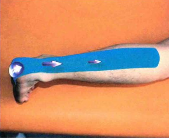 第一步:肌肉贴扎及韧带(肌腱)贴扎:采用I形贴布,Y形贴布或三爪形贴布,在小腿三头肌非牵伸状态下将锚固定于肌肉附着点,然后呈背屈拉伸肌肉摆位进行后续贴扎。贴布先贴至跟腱,沿肌腱长轴方向用较大拉力固定于肌腱区域,当贴布移行至小腿下1/3时,以白然拉力沿小腿三头肌继续延展,并将贴布的尾无张力固定。