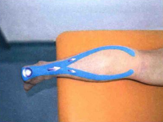 痛点提高及肌肉贴扎:针对小腿三头肌持续发力造成的,且无深层肌肉代偿的跟腱慢性损伤,可予以X形贴布进行痛点提高及肌肉贴扎(小腿三头肌放松)。