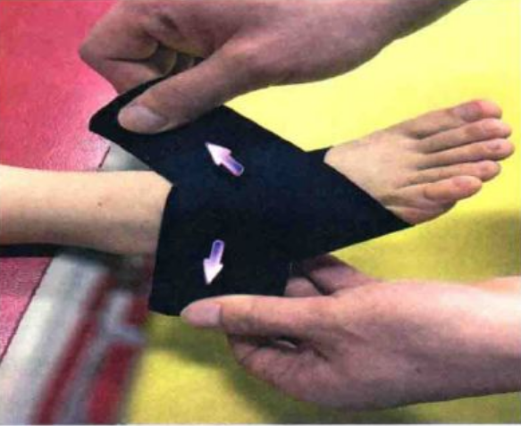 螺旋贴扎:它是另一种改善感觉输入、稳定躁关节的贴扎。于踝关节中立位,将I形贴布的锚固定于中足下方,两端向上绕行至足背,并向内,外踝下方延展,呈螺旋贴扎。其中内踝处的拉力为自然拉力,外踝处的拉力可为自然拉力至中等强度拉立力。
