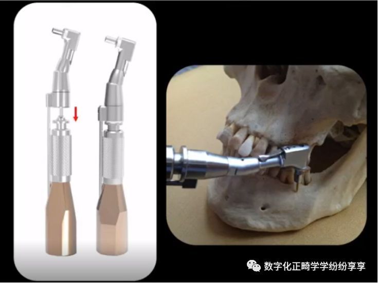 助攻型植入前需要先用圆钻钻开骨皮质,然后用骨钻形成通道以引导植入,最后将螺钉自身顺通道拧入。主要应用在上颌腭侧、下颌颊侧、磨牙后区;种植机或根管治疗用反向弯头手机,先锋钻钻速300-500转/分,不使用过大压力,减小产热,钻孔方向稳定,防止扩大孔径。