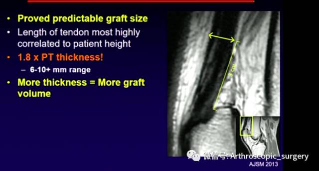 再者,术前MRI能预先评估移植物的尺寸,其直径比髌韧带大1.8倍(直径约6-10mm)。在距髌骨上缘约3cm处测量股四头肌厚度,其厚度越厚,能获得的移植物越多!