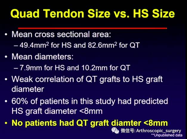 和腘绳肌相比较,无论在横断面积还是移植物直径股四头肌腱移植物都优于腘绳肌肌腱移植物,在研究中发现60%的患者其移植物直径都小于8mm,而股四头肌腱移植物其没有病人移植物直径小于8mm。
