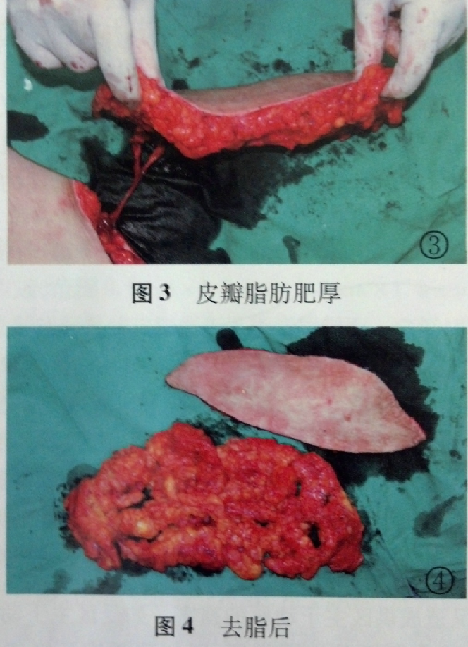 2、皮瓣的修薄,皮瓣断蒂前将皮瓣翻转平铺,在镜下顺穿支血管分离解剖至穿支进入真皮下血管网层,显露穿支血管在浅筋膜走行后,保留真皮下3~5mm脂肪组织,剔除过多的脂肪组织,去脂时注意在穿支血管周围留有少量疏松组织以保护穿支蒂以免受损伤;该方法可在同一平面解剖分离,操作方便,断蒂前皮瓣保留血流灌注,这样辨认和保护浅筋膜内分支,同时去除了多余的脂肪组织,有利于皮瓣供区的直接闭合。