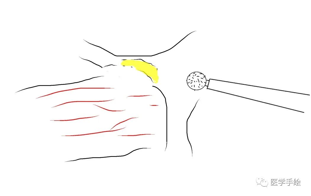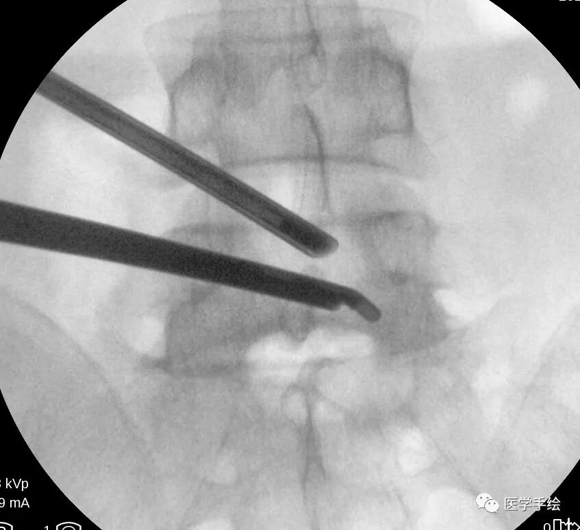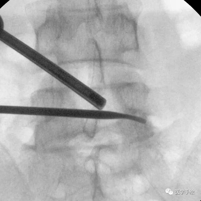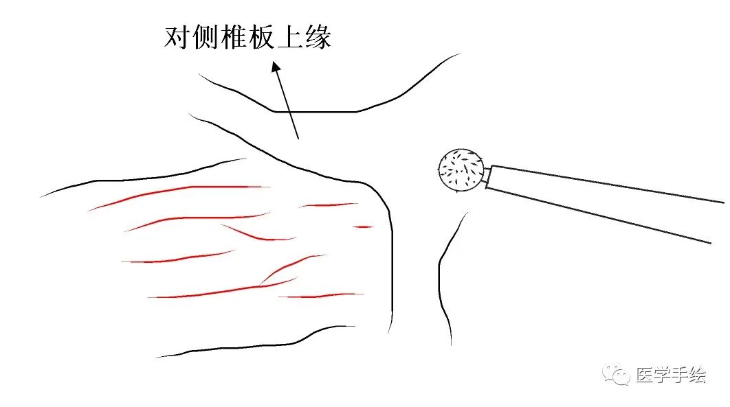 为了避免translamina入路棘突磨穿风险,我们尝试先显露对侧椎板上缘明确对侧椎板方向。