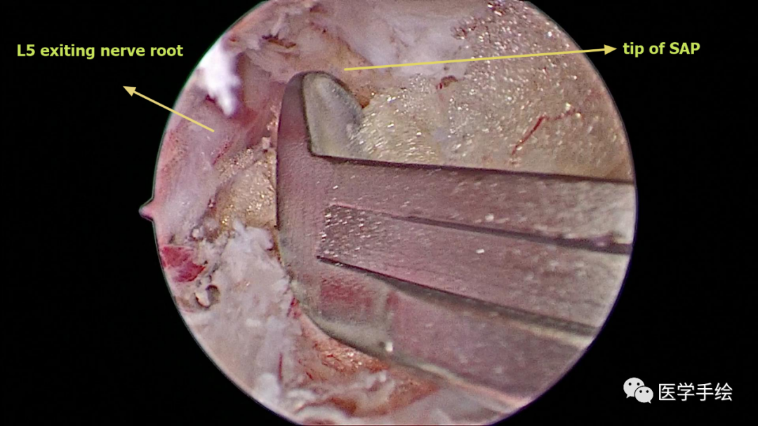 在对侧椎板上缘指示方向下行translamina操作,直至显露对侧黄韧带上缘和椎间孔区域黄韧带