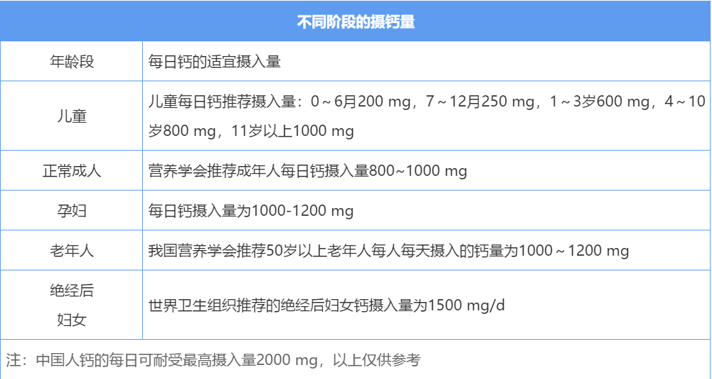 以上不同阶段的人群每日摄取补钙量建议如下表: