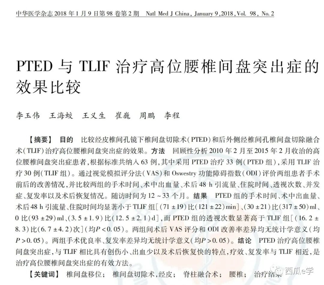 李玉伟等对ULDH采用PTED治疗33例,TLIF治疗30例,PTED组除透视次数显著高于TLIF组外(P<0.05),手术时间、术中出血量和患者满意度均显著优于TLIF组(P<0.05),与TLIF相比具有创伤小、手术时间短和恢复快等优势。随访12~33个月,2组均未出现神经根损伤、椎间隙感染,PTED组1例术后10个月原节段复发再次行椎间孔镜术后缓解,根据ODI改善率评价疗效,PTED组为93.9%(31/33),TLIF组为93.3%(28/30),2组手术优良率和复发率均无显著差异(P>0.05)。