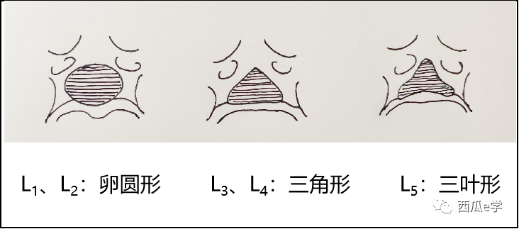 上腰椎位于胸椎和下腰椎之间,椎体横径、椎间盘厚度、横截面积自上而下逐渐增大。上腰椎管多呈卵圆形,且硬膜囊内神经组织较多,硬膜外脂肪分布少,较下腰椎管明显狭窄;下腰椎管多近似三角形和三叶形且有明显的侧隐窝,明显区别于上腰椎(如下图)。