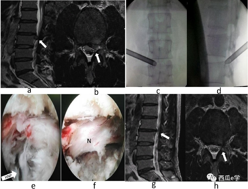 (a 和 b)磁共振矢状位和横断位显示椎间盘突出;(c 和 d)透视引导下,使用18G的穿刺针经安全三角到突出靶点;(e 和 f)内镜下可见突出的椎间盘髓核组织和减压后的神经根;(g 和 h)术后复查MRI显示突出的椎间盘已摘除,硬膜囊和神经充分减压。