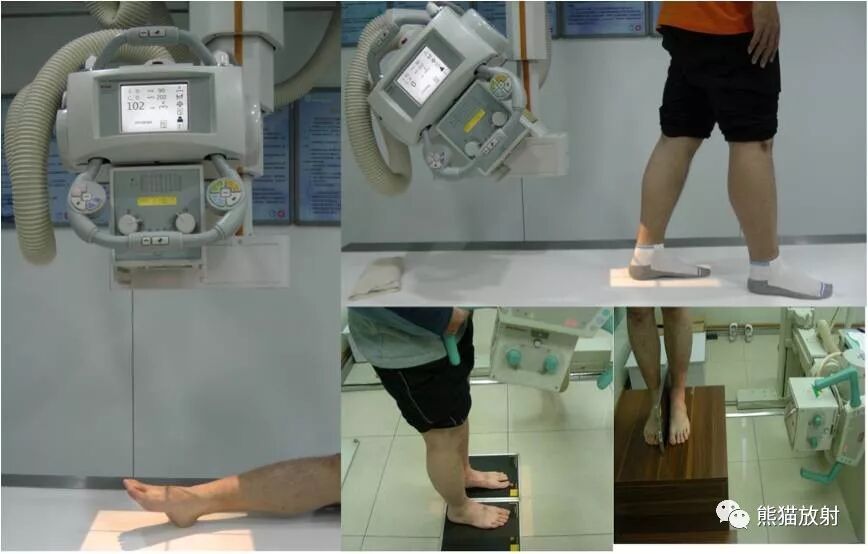 拍摄足负重正侧位,45°内斜位,跟骨轴位X线片。