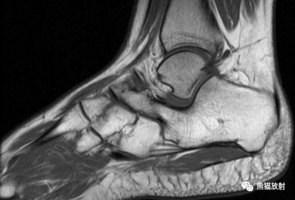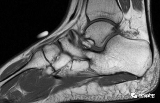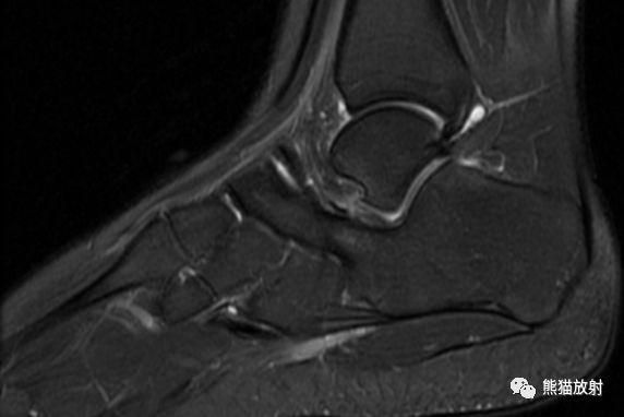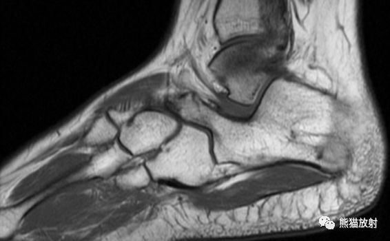 MR矢状PD压脂、矢状T1WI;主要表现:跟骨和舟骨之间可见骨性联合,MR上相应区域无水肿