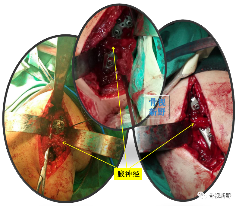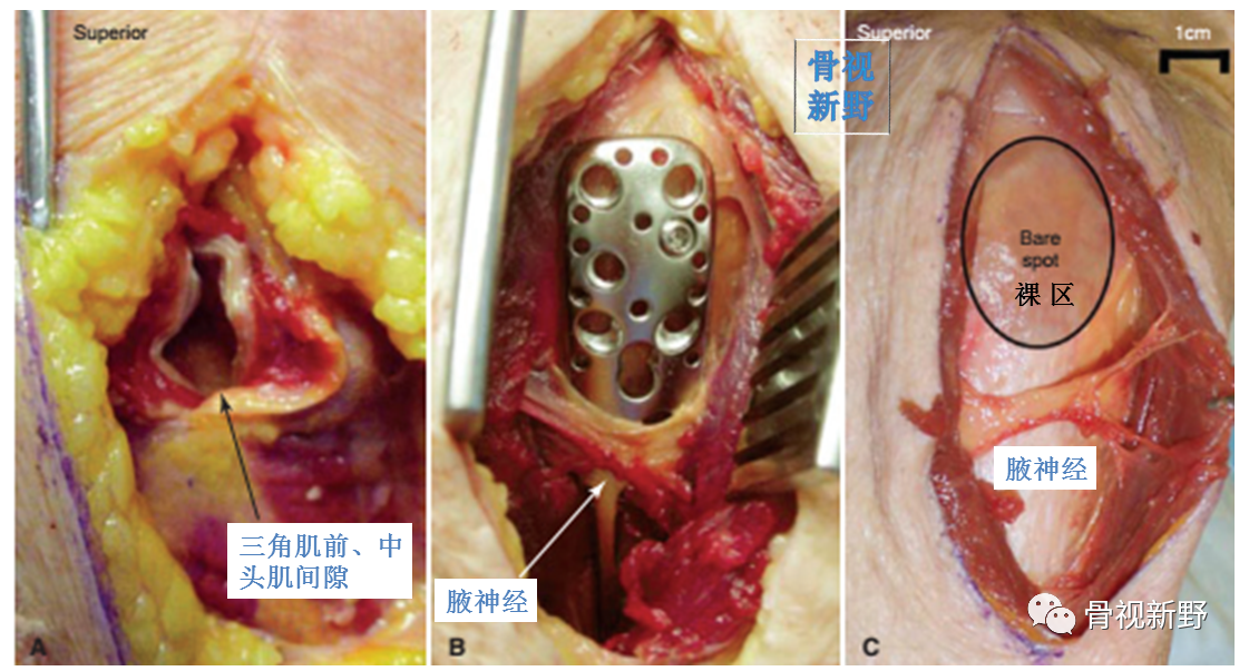 本文作者应用该入路体会,保护腋神经的肩前外侧三角肌劈开入路比较适合大结节骨折及肱骨距完整的肱骨近端骨折拟ORIF者(术中所见如下图)。