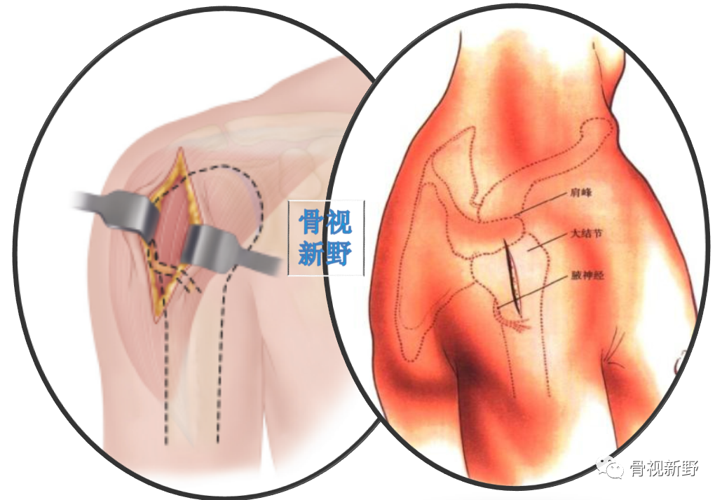 逐层切开皮肤、皮下,劈开三角肌浅层,但深层需仔细钝性分离、解剖出横行的腋神经(肩峰下5~7cm,平均6cm;大结节下约3.5cm)加以保护。在三角肌的前、中部分交界区域(即三角肌的锁骨部和肩峰部),除腋神经主干外,无其它分支。