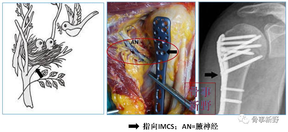 肱骨近端骨折多选用PHILOS钢板,标准的置板位置在大结节顶点下5-8 mm;结节间沟外侧5-10 mm。置于此位置,PHILOS与骨的贴附好,角稳定螺钉的排布、对肱骨头的抓持也最合理。但该微创入路,由于受切口和腋神经位置的限制(腋神经/旋肱后血管神经束距骨面约6mm的间距),安放标准位置的PHILOS板会面临打不了下内侧肱骨距螺钉(inferomedial calcar screw, IMCS)的尴尬。研究报道,腋神经血管束正好横行骑跨在标准安放的PHILOS的IMCS孔上【Stecco 2010】。而IMCS的2枚斜向螺钉对于干骺段粉碎、肱骨距不完整的肱骨近端骨折起最主要的头部支撑作用。如果没有IMCS的支持,则很可能发生肱骨头内翻、塌陷、甚至螺钉切出,有文献报道内翻畸形的发生率在 3%~12% 之间。IMCS对肱骨头的支撑犹如“树杈对鸟窝”的支持,起决定性作用(图7)。