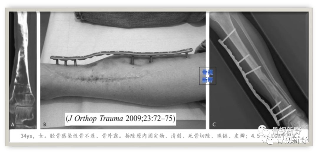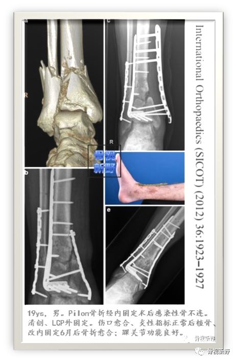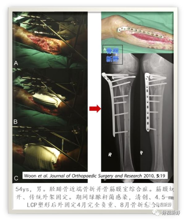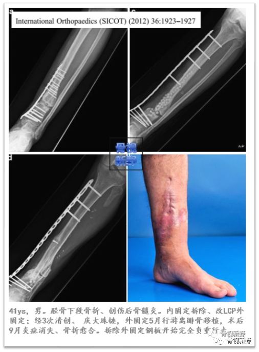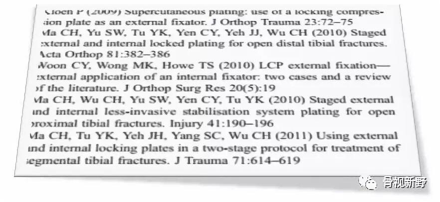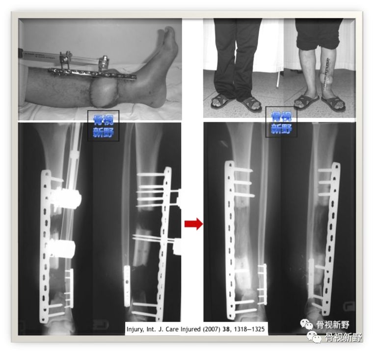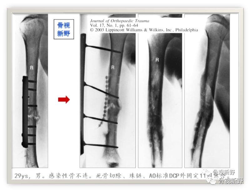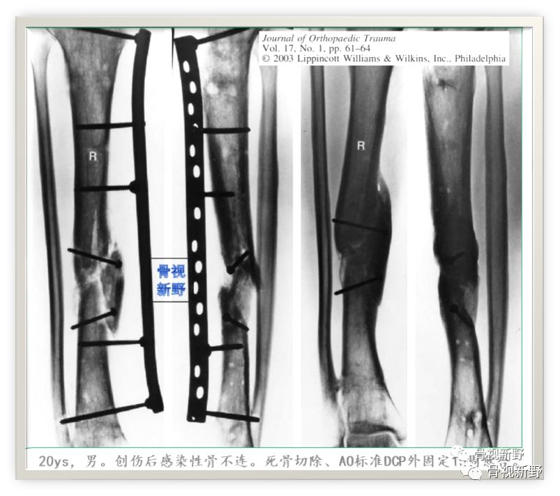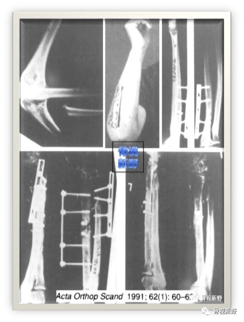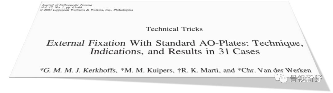 2003年,Rene K.Marti团队再次报道了将AO标准钢板作为外固定架用于开放性骨折以及骨感染性骨不连的固定病例31例,也取得了较好的疗效。