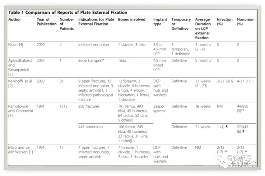 锁定钢板外固定的不愈合率约5-17%(各家文献报导略有不同,具体见下表),其与传统外固定架的不愈合率相当(≤20%)。