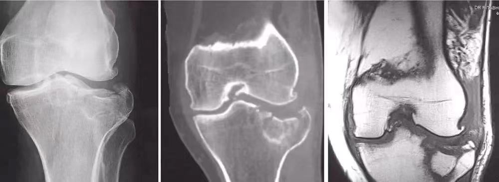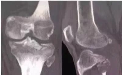 股骨髁部骨折:暴力强大,压痛点在股骨髁部,X线片示股骨髁骨折。