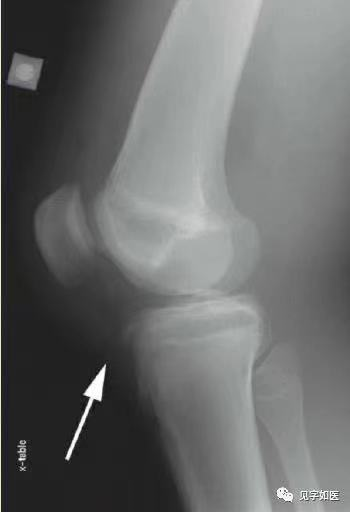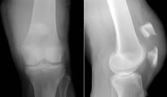 副髌骨骨折:局部无明显压痛,伸膝无明显受限;X线片见骨块边缘整齐、光滑,多对称存在,多发生在髌骨的外上角。
