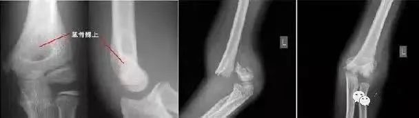 肱骨内髁骨折:在小儿肱骨内髁内骨化中心未出现之前,X线上不能显示骨化中心位置。肱骨内髁骨折与内上髁骨折主要根据X线片上肱骨小头肱骨内上髁及桡骨小头骨化中心的位置变化加以鉴别。