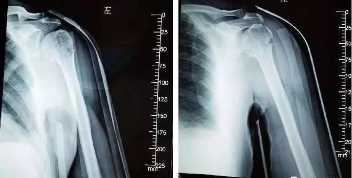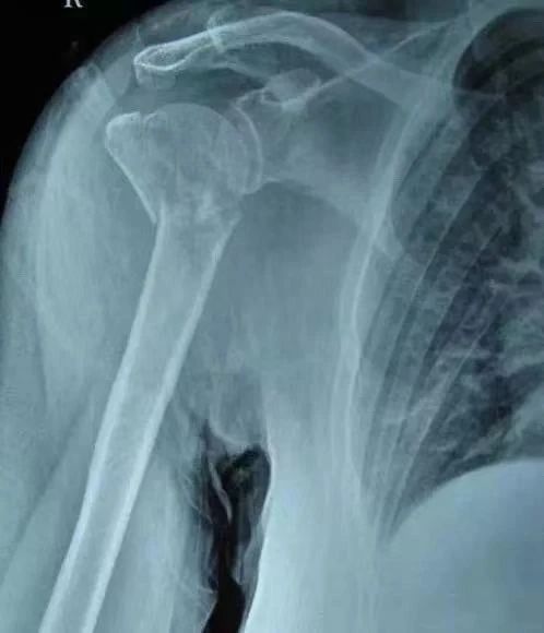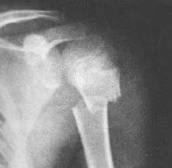 肱骨外科颈骨折:肿痛在肩部,肱骨上端压痛;X线正位片及穿胸位可显示骨折线在肱骨解剖颈下2一3cm;治疗后骨折多能愈合。