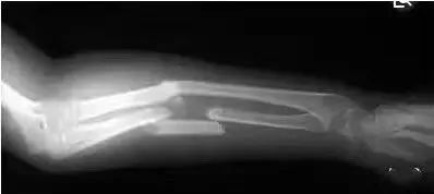 尺桡骨干下1/3骨折:前臂中下段肿痛、畸形,异常活动,前臂旋转功能受限,尺桡骨下1/3可扪及骨擦感,前臀活动障碍更明显;X线片示尺桡骨干下1/3骨折,无下尺桡关节脱位。