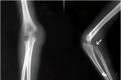 肱骨外髁骨折:肿胀及压痛局限于肘外侧,有时可触及骨折块;X片摄片桡骨纵轴线不通过肱骨小头骨化中心。