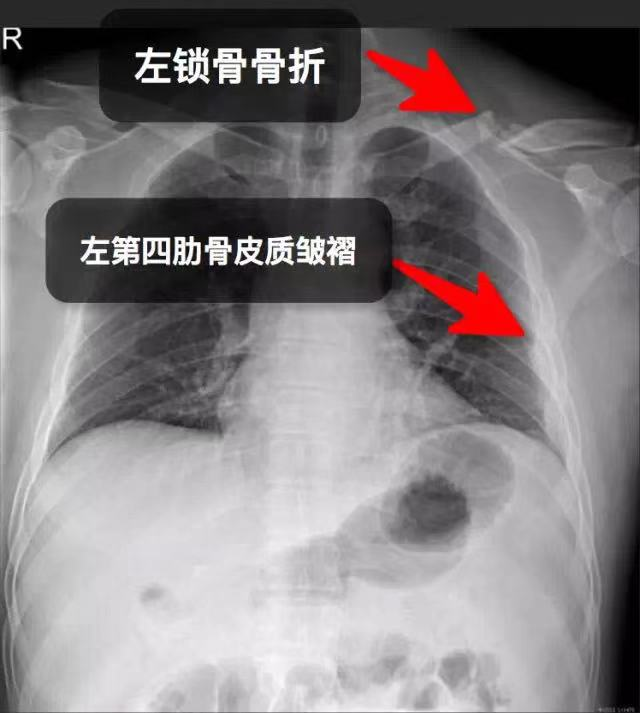 肋骨骨折:伤后胸部疼痛,咳嗽及深呼吸时疼痛加重;挤压胸廓时,骨折部分疼痛加剧;有时可合并气、血胸;X线片示肋骨骨折。