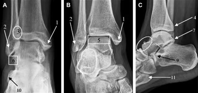 踝部韧带损伤:多由踝关节扭伤所致,肿痛,压痛点在内踝下方或外踝的前下或下方,无骨擦音和畸形;X线摄片可排除骨折。