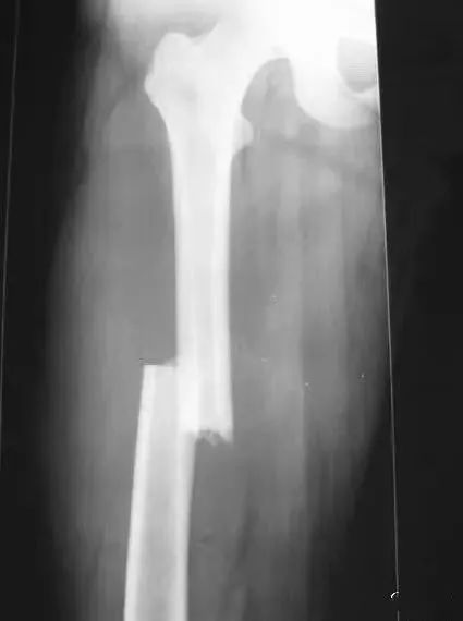 股骨干上1/3骨折:青壮年及儿童多见,有明显外伤史;局部压痛敏锐,出现短缩、成角或旋转畸形,可触及骨擦感和异常活动;X线片示股骨干骨折。
