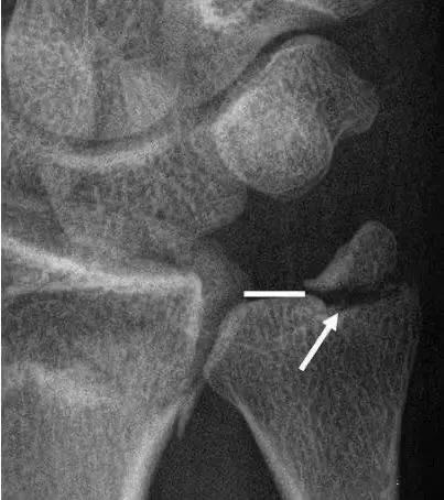 桡骨茎突骨折:腕部桡侧肿胀、疼痛,有骨擦音,X线片见骨折线在桡骨茎突。
