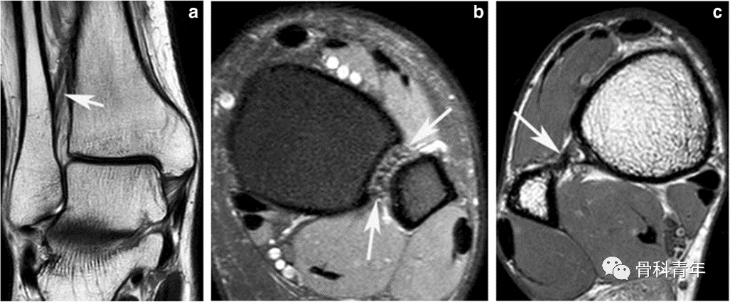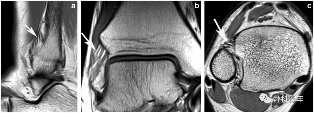 下胫腓韧带解剖:下胫腓前韧带 (AITFL)。a图矢状面和 b图冠状面MR图像显示AITFL 的多个分束,由脂肪分隔(白色箭头)。c图横断面MR图像显示AITFL由于斜行而呈现为多点状(白色箭头)。
