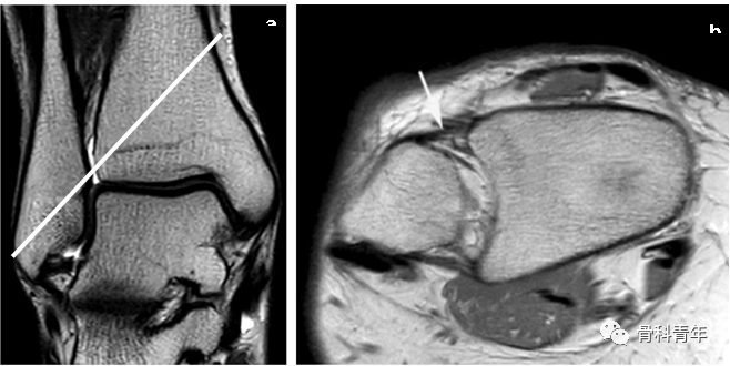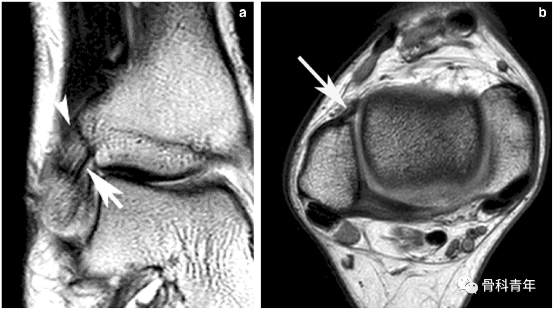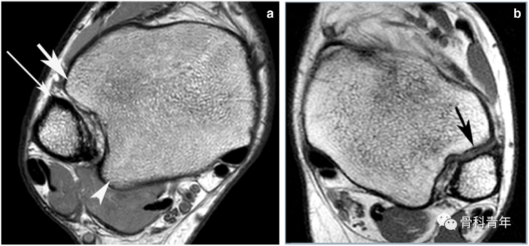 下胫腓关节 (DTFJ) 的 MR 解剖,横断位。a图,Chaput 结节(前方箭头)、Volkmann 结节(后方箭头)和Wagstaffe-LeFort 结节(左上细长箭头);b图可见胫腓骨接触区。