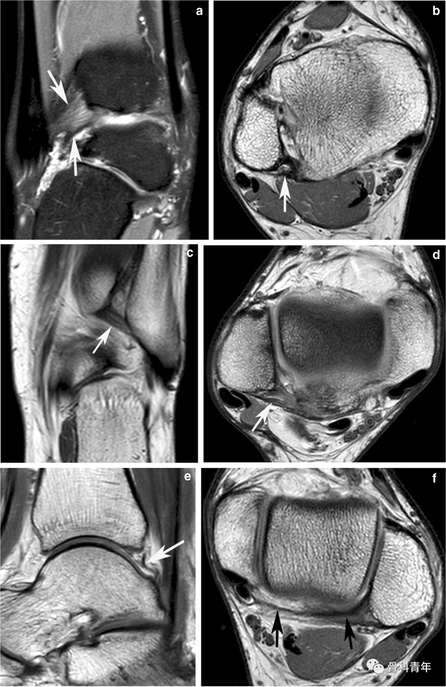 下胫腓后韧带 (PITFL)解剖。a图和b图显示浅层PITFL,呈多束(箭头所示)。c图和d图显示深层的PITFL,也称为下胫腓横韧带(ITTFL)(箭头所示)。e图和f图显示骨间韧带(箭头所示)。