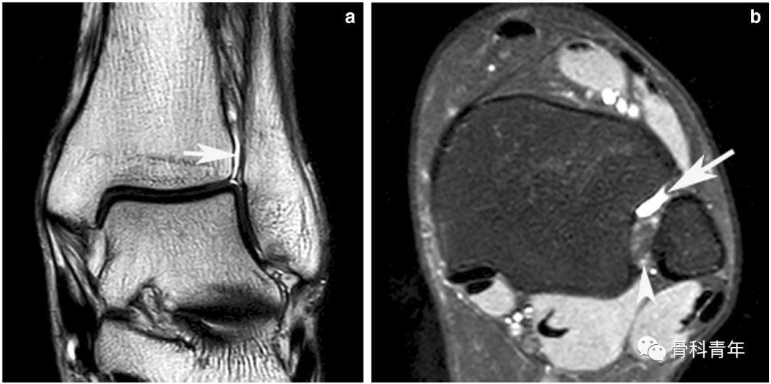 下胫腓关节 (DTFJ) 的 MR 解剖。a图冠状位抑脂相,b图横断位抑脂相。可见下胫腓联合皱襞(长箭头),b图短箭头提示脂肪滑膜皱襞。
