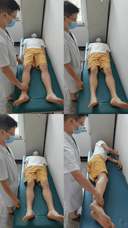 髋关节屈曲强度可以在仰卧位进行评估,要求患者直腿抬高。抗阻力测试:膝关节伸直、髋关节屈曲30°位,检查者用手下压脚踝,要求患者积极抵抗。