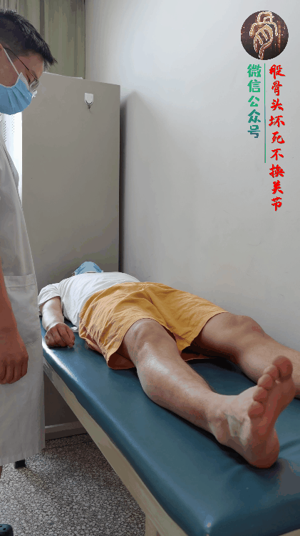 仰卧位检查可以在站立位检查之前或之后进行。大多数检查者更倾向于从仰卧位检查开始,它被称为髋关节病最具体的检查方式之一。下肢轻轻地来回滚动,使股骨头在髋臼内移动,如果患者有疼痛感,则为阳性,提示关节内病变。检查者的手最好放在患者大腿上进行滚动测试,以避免将此测试与任何膝关节病理相混淆。该检查可以避免受到髋关节周围肌肉力量或位移的影响,因此,对于任何髋关节疼痛的患者都是一个很合适的初始检查。