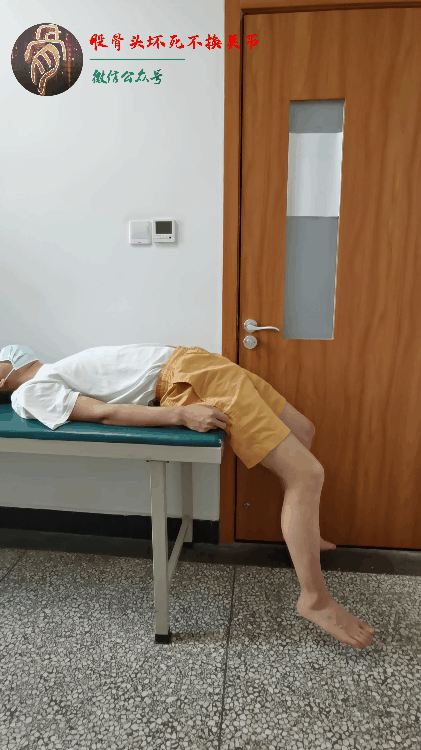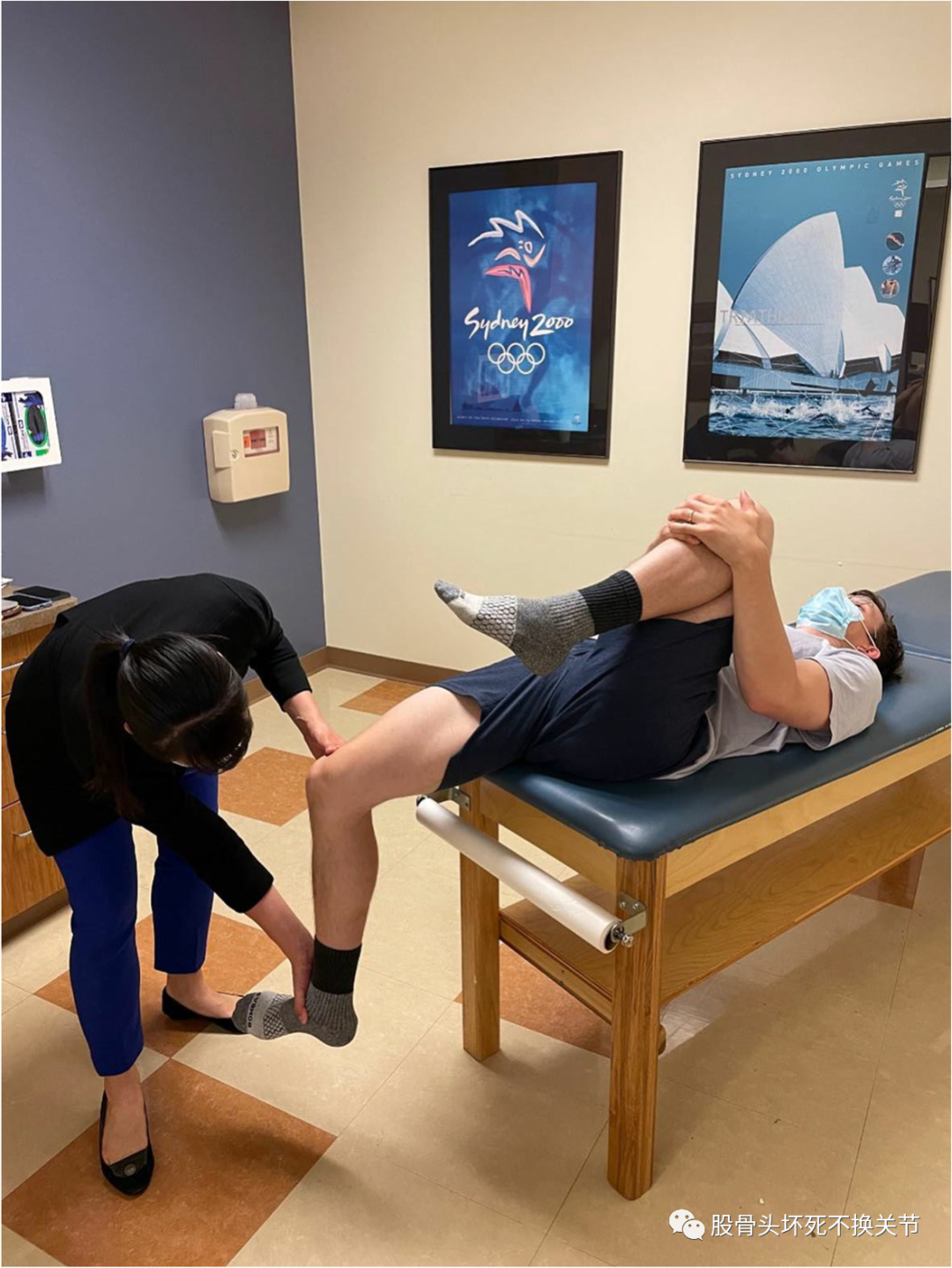 检查方法:患者仰卧位在检查台的末端边缘,对侧由患者抱膝屈髋,患侧髋关节过伸,检查者外旋患髋,使关节囊前部拉伸(图9),如果该动作引起髋关节前方疼痛,则为阳性 [43]。值得注意的是,在这个检查动作中如果出现髋关节后方疼痛,可能意味着髋关节后侧撞击。该检查对髋关节微不稳定的诊断敏感性为71%,特异性为85%,阳性体征有效性为86%[44]。