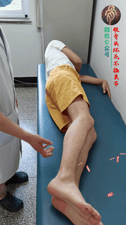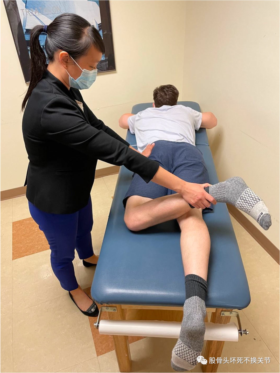 当被动屈髋并外旋时,可发生股骨头外旋,提示髋关节内激惹,见于股骨骨骺滑脱、股骨髋臼撞击和髋关节关节炎。髋关节内旋减少可见于FAIS患者,与内旋小于10°;的年轻运动员进行性骨关节炎影像学改变有关[15]。侧卧位,患者膝关节弯曲至90°,医者进行髋关节后伸检查,测量髋关节后伸角度,通常为5~10°。