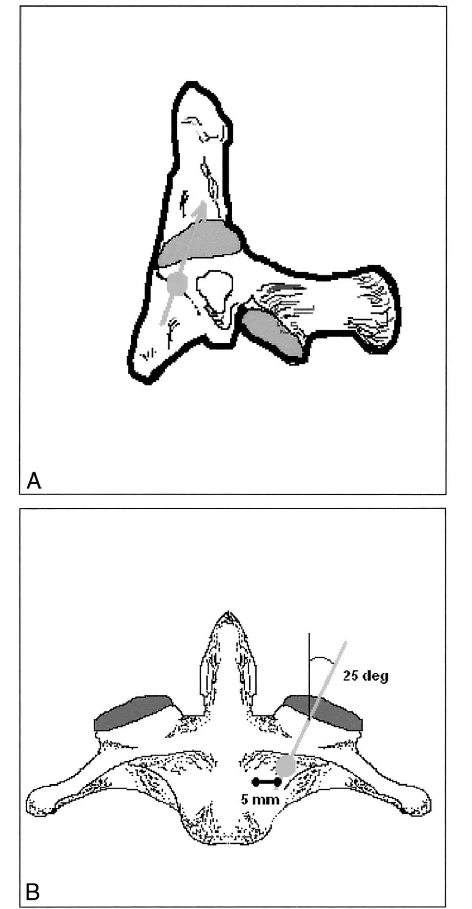 3.建议双C臂或G臂引导,侧位看,进钉点位于C2侧块的前唇下方。瞄准颅骨方向,瞄准C1-C2关节的中心。正位看,进钉点位于齿状突基部外侧5 mm处,横向外展25度。