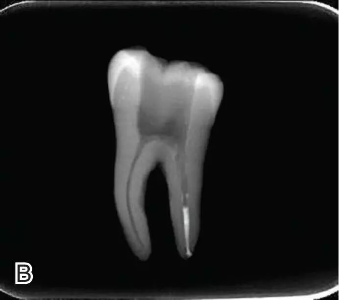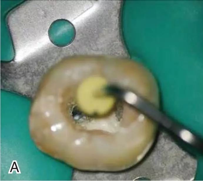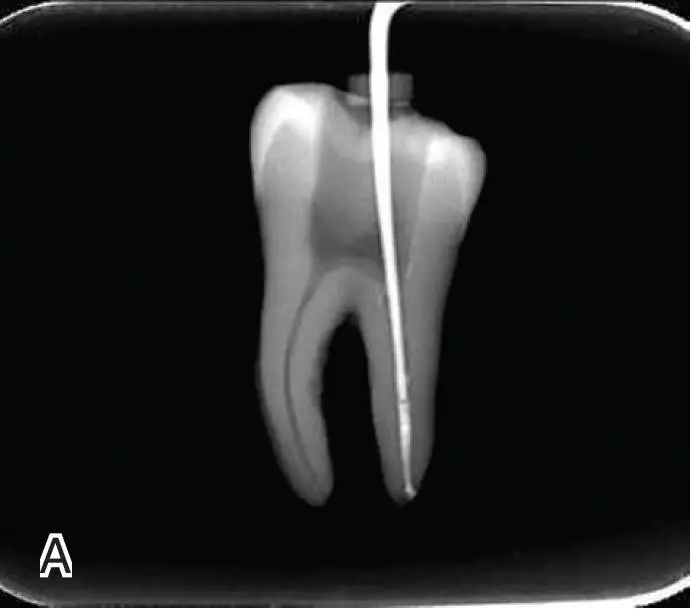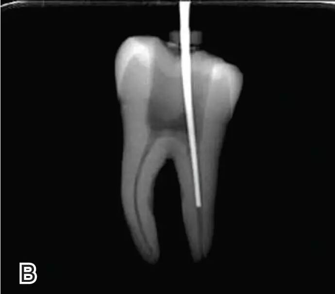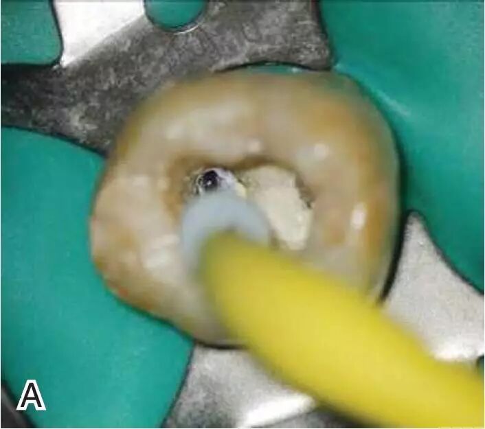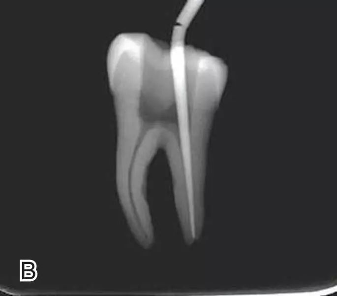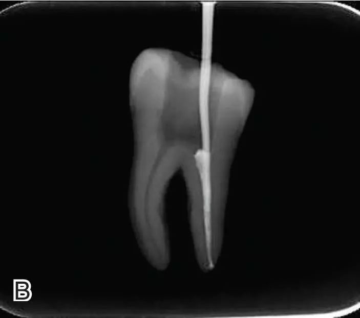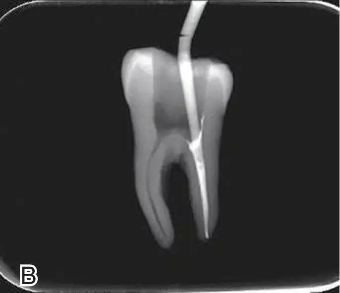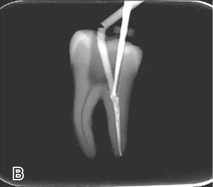 图7退出携热器工作尖A.垂直加压器加压 B.根尖段的充填完成