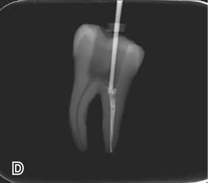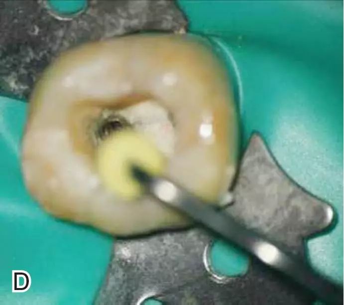 图5去除根管口外牙胶尖A、B.携热器尖去除根管口处的牙胶尖 C、D.大号垂直加压器轻轻加压