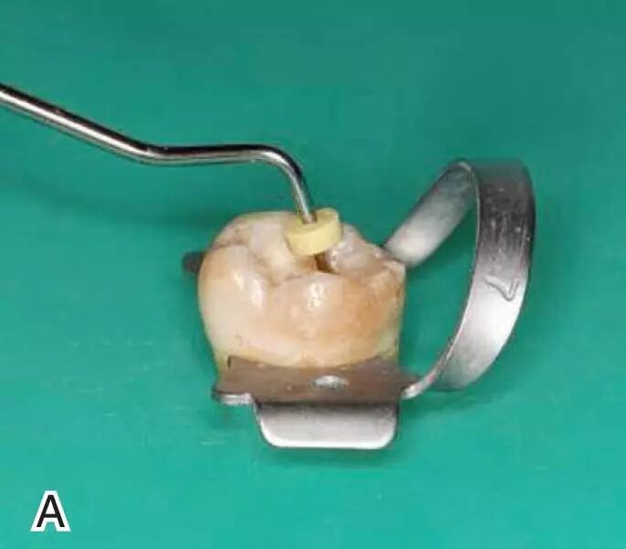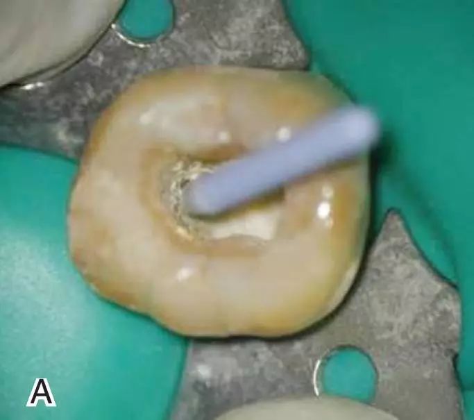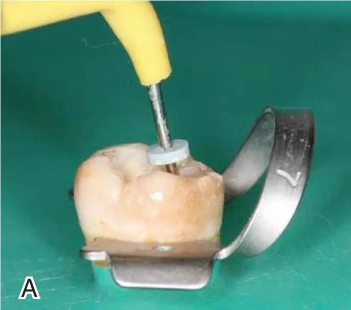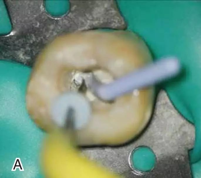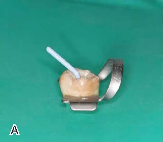 图1 选择携热器工作尖,A.试携热器尖 B.工作尖在根内的位置
