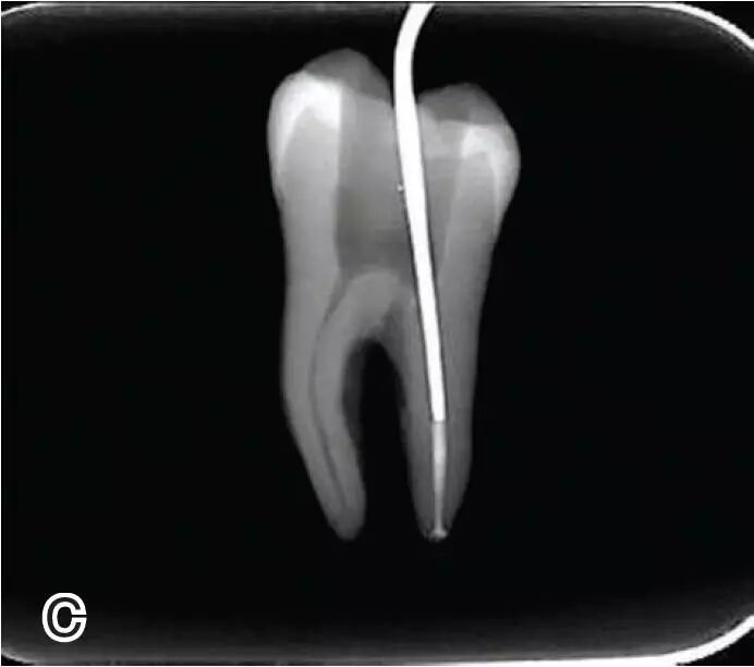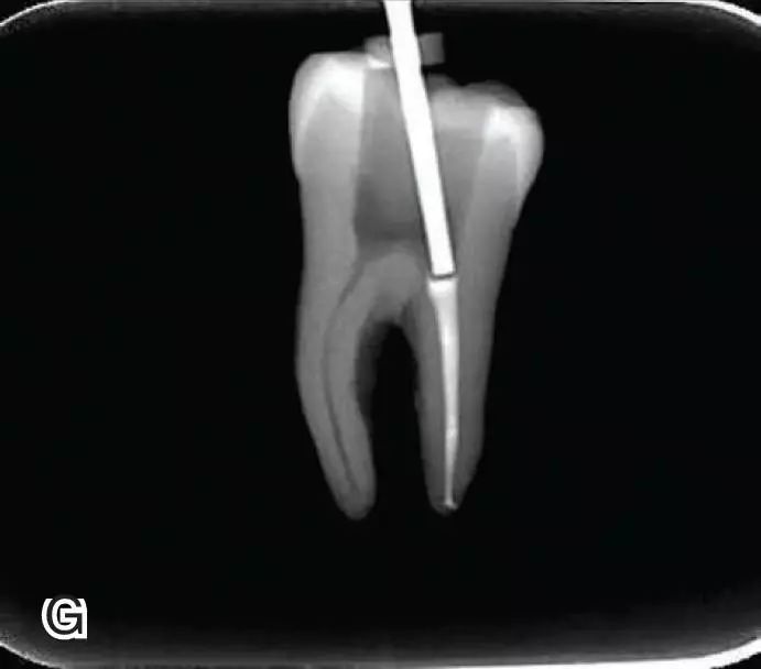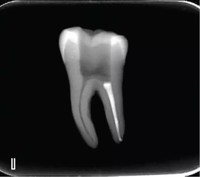 选择非标准牙胶尖(如0.04、0.06 锥度牙胶尖)作为主尖,型号一般与根管预备最大号的器械型号一致,能到达距根尖0.5~1 mm 处,主尖尖段与根管壁紧密接触。拍试尖X 线片进行确认(图3)。