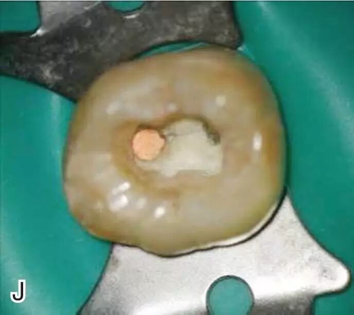 图8热牙胶根中上段的充填A、B.注射仪注射中段热牙胶C、D.垂直加压器加压 E、F.注射仪继续注射上段热牙胶 G、H.垂直加压器加压 I、J.完成根中上段的充填